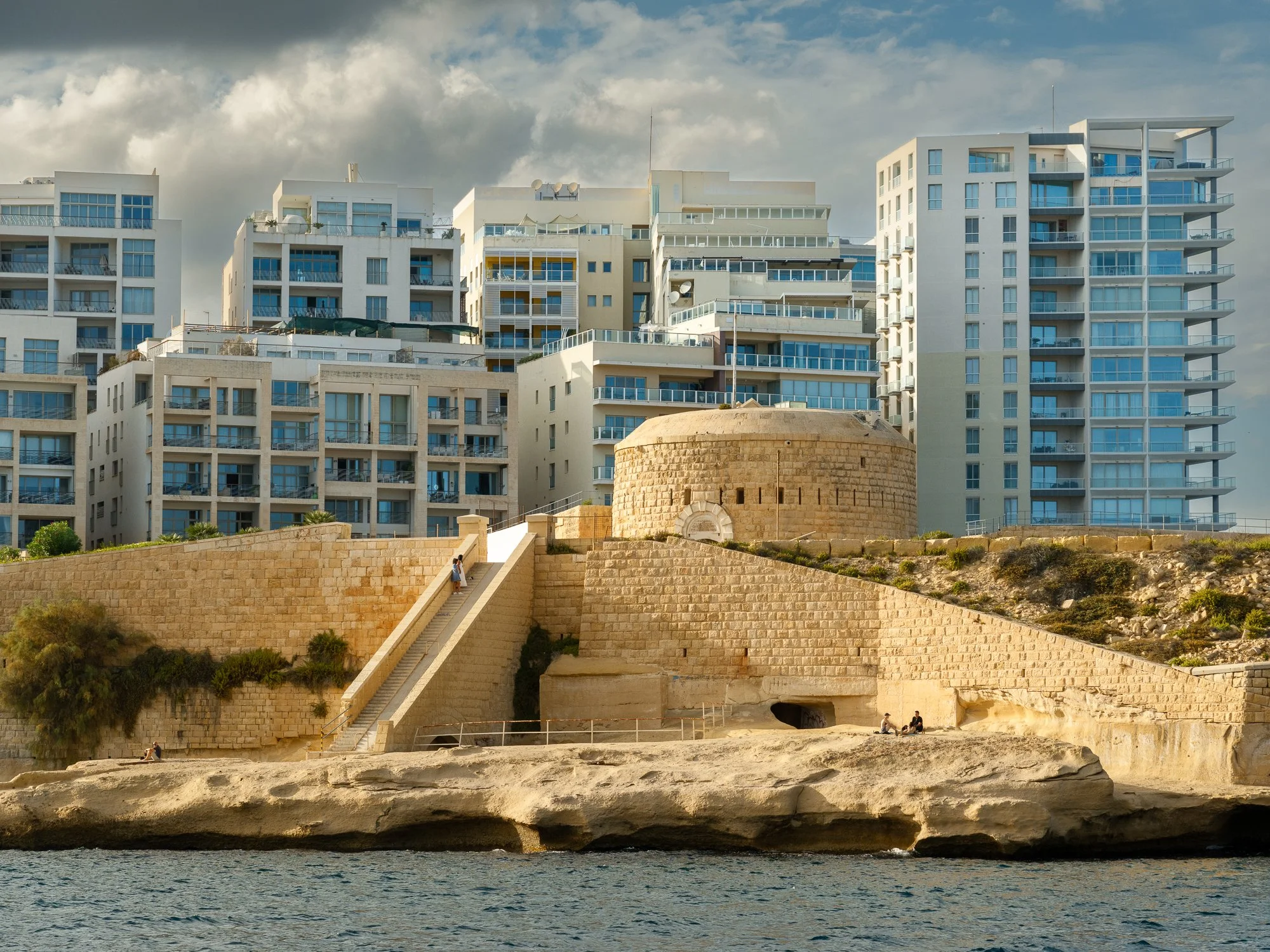 And finally… Fort Tigné on the tip of Sliema seen from the entrance to the harbour. The old fortifications built with local limestone are now loomed over by modern (anonymous, could-be-anywhere) apartment blocks and hotels made from the modern universal glass, concrete and steel. From what I read, the best limestone quarries are now well past their peak production so this is the future, with a complete change to the feel of Malta.